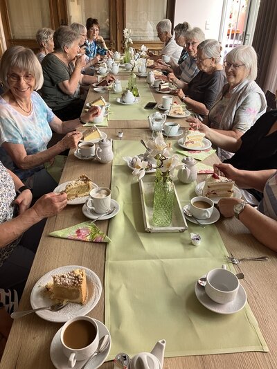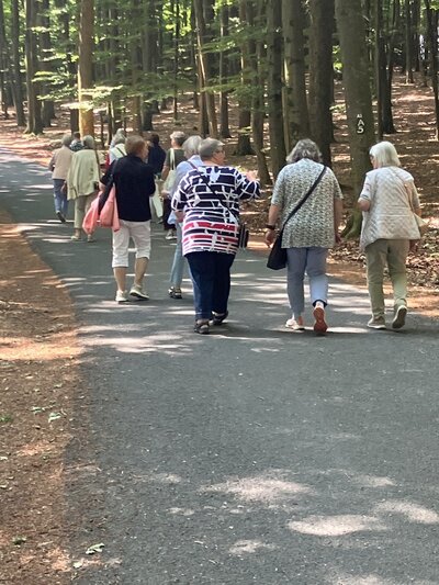 Anschließend ging man den wunderbar lichtdurchzogenen Waldweg zum Hotel-Gasthof „Zum Berghof“, wo Wilma Jungermann die Teilnehmerinnen zum Kaffeetrinken angemeldet hatte. Es wurde sich rege ausgetauscht und die Frauen erlebten einen sehr schönen Nachmittag „ die Andacht und das fröhliche Miteinander“ – Ja, unter dem Titel „Geh aus mein Herz und suche Freud“- fuhren alle wieder froh und munter nach Hause.