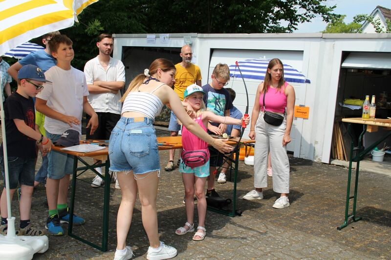 Ab mittags ging es dann wortwörtlich „heiß her“, denn die Sonne brachte knackige 28 Grad auf den Parkplatz am Johannesheim. Neben der beliebten Erbsensuppe mit Würstchen konnten die Besuchenden auch Currywurst mit Pommes zum Mittagessen verspeisen. Dazu versorgte das Rondell mit gekühlten Getränken sowie frischgezapften Bier. Nebenher hatten die jungen Schützen die Möglichkeit sich beim Kinder-Vogelschießen zu duellieren. Sich durchsetzen, den Vogel abschießen und sich zum Kinder-Schützenkönig krönen, konnte Jakob Sting.