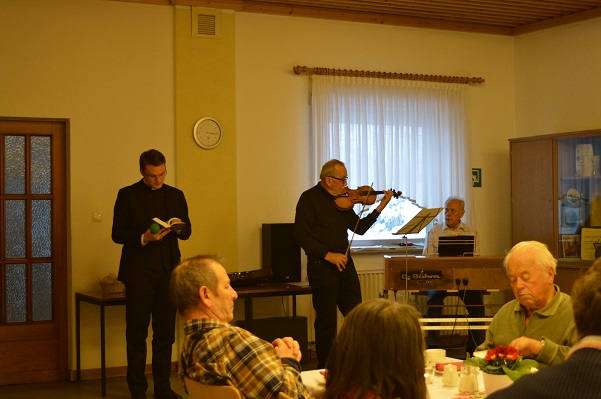 So begann der Nachmittag um 15:00 Uhr mit einer kurzen Begrüßung durch Annelie Wirke, Pfarrgemeinderatsvorsitzende, die auch den Nachmittag durch das Programm führte. Mit einer nachweihnachtlichen Andacht stimmte Diakon Dominic Molitor die Gemeindemitglieder auf den Nachmittag ein. Wieder mit von der Partie waren auch Egon Müller (Geige) und Hans Dörr (Keyboard), die nicht nur zur Andacht, sondern auch durch den Nachmittag für die musikalische Begleitung sorgten.