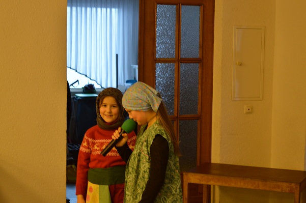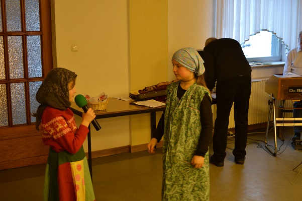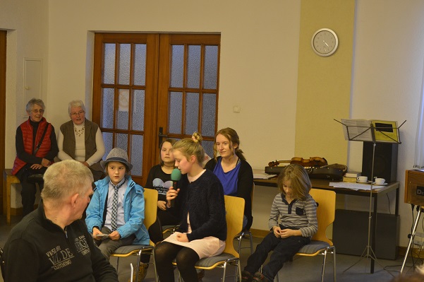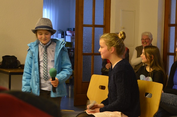 Ein besonderer Höhepunkt war der Auftritt unserer „Kleinsten“. Drei Dahlbrucher Messdienerinnen hatten zwei Sketche einstudiert und diese zum Besten gegeben. Im ersten Sketch „Auf dem Bauernhof“ traten Nele Leidig und Emilia Schneider als Bäuerin und Magd auf. Die stotternde Magd wollte wegen Stress kündigen, weil sie es nicht schaffte alle Hühner in den Stahl zubekommen. Durch ihr Stottern trieb sie zum Schluss alle wieder aus dem Stahl. Im zweiten Sketch „Im Theater“ traten Nele Leidig als Otto und Luna Ballion als Emma auf. Emma wunderte sich im Theater über den Gestank, der ihr von zu Hause bekannt vorkam und diskutierte mit Otto darüber, ob er sich den nun gewaschen hatte oder nicht. Dieser wies alle Schuld von sich und bestätigte, dass er sich sogar geduscht und umgezogen hätte. Auf Emmas Frage, ob er den auch frische Socken angezogen hatte, antwortete Otto: „Natürlich, die alten habe ich der Jackentasche“. Diese zog Nele zur Belustigung aller natürlich aus der Jacke. Unterstützt wurden sie durch Emilia Schneider, Sarah Strunk und Julius Leidig als Statisten im Hintergrund, um ein bisschen Theateratmosphäre zu erzeugen.