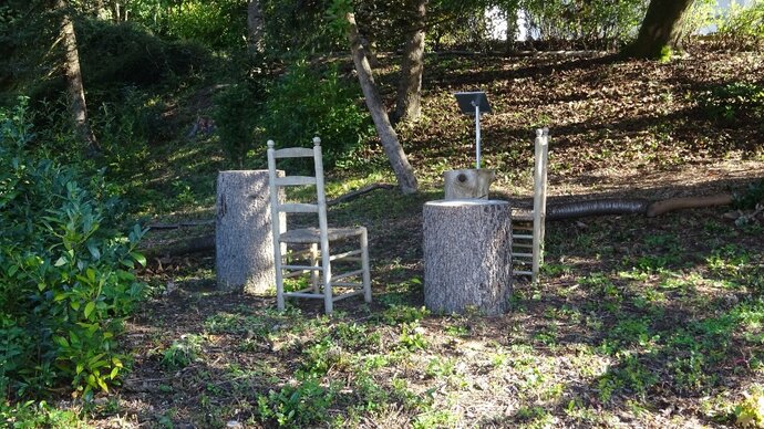 Die Installation besteht aus drei Baumstämmen, die symbolisch für die „Festverwurzelten“ und „Bodenständigen“ in einer Gemeinschaft stehen. Sie haben jedoch in ihrem Kreis Platz gelassen und Stühle aufgestellt und signalisieren: Setzt dich zu uns, komm in unseren Kreis, bei uns ist noch Platz.