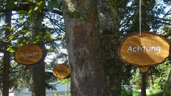 Ein paar Schritte weiter erreicht man die zweite Station mit dem Titel „Ich rede gut über dich“. Der Meditationspfad steigt leicht an, so dass der Weg und der Blick nach oben gerichtet sind. Die Installation wurde daher nicht auf dem Boden aufgestellt, sondern in den Bäumen aufgehängt. Auf Baumscheiben liest man eingravierte Begriffe wie Respekt, Empathie, Achtung, Liebe …