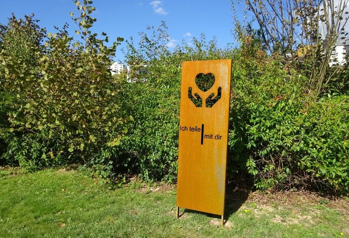 Die nächsten beiden Stationen – Station 3 „Ich gehe ein Stück mit dir“ und Station 4 „Ich teile mit dir“ – werden aus Cortenstahl-Blechen gefertigt. Die Bleche sollen jedoch nicht als Träger für aufgeschraubte Motivtafeln dienen, sondern unmittelbar so gestaltet sein, dass das Blech selbst das Motiv enthält.