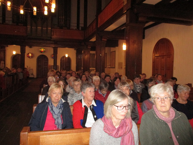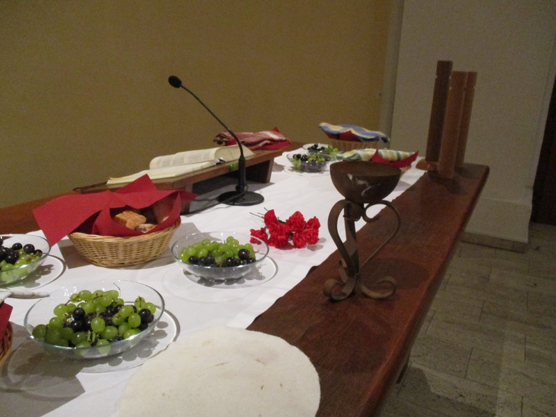 Es ging um den Tisch, an den wir alle eingeladen sind. „Es ist noch Platz an deinem Tisch. Du lädst mich ein, ich komme gern mit Lust und Liebe mit Freude und mit Herz.“ So sangen wir im Polkarhytmus – am Infoabend sogar dazu tanzend. Schwungvoll wurden die textlich ansprechenden meist so fröhlich klingenden Lieder wie dieses von Klavier, zwei Flötenstimmen und Gitarren begleitet. Erstmal saßen fünf Frauen stellvertretend für unterschiedliche Frauen Sloweniens an dem Tisch, später eine andere Gruppe, die in ihrem Spiel entsprechend dem Gleichnis vom Gastmahl, von den Hecken und Zäunen zusammengesammelt, noch dort Platz nahmen. Es ist noch Platz! Ein Satz, der durch den gesamten Gottesdienst begleitete. „Wir sind erstaunt, wie gut das schmeckt und welche Kräfte es in uns weckt.“ Hieß es im nächsten Lied und so wurde dem gemeinsamen Schmecken bei einem Agape-Mahl Raum gegeben und auch beim Rausgehen konnte man sich noch bei Brot und Trauben weiter stärken. In Gedanken an die Frauen, die weltweit nicht mit am Tisch sitzen können, wurde die Kollekte eingesammelt. 894,15 € wurde zusammengelegt und gehen an das Weltgebetstagskomitee, das die Gelder an Projekte weiterleitet, die Frauen und Kinder stärken.