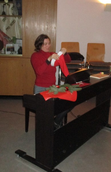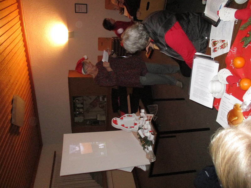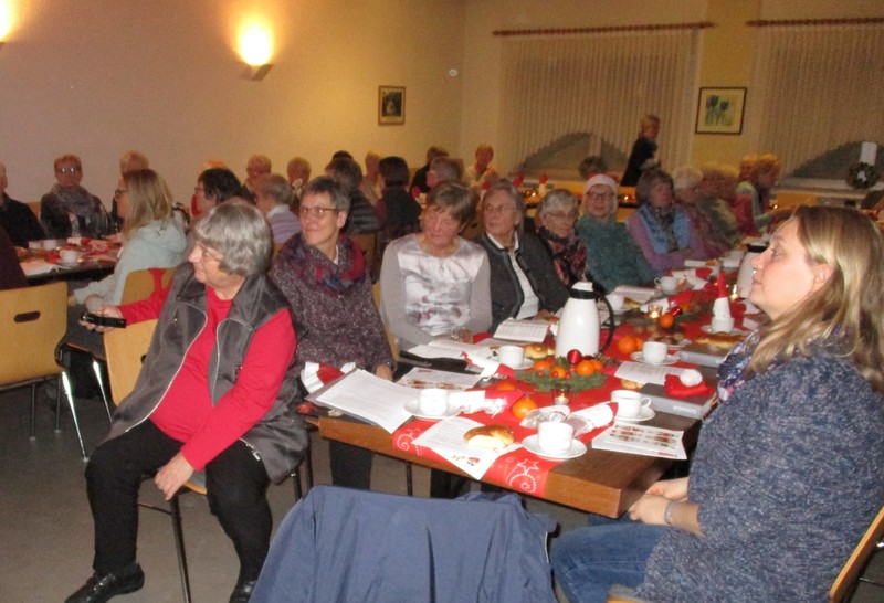 Im Anschluss kamen die Frauen der kfd bei Gebäck und Heißgetränken zur Adventsfeier im Augustinusheim zusammen. Als Thema des Abends wurde der Nikolausabend näher betrachtet. Insbesondere die Bedeutung des Schenkens und Beschenktseins standen im Mittelpunkt. Anhand von kurzen Geschichten und zugehörigen Bildern näherten sich die Teilnehmerinnen dem vielschichtigen Thema „Die guten Seiten des Lebens – alles geschenkt!“. Zwölf Frauen, passend mit Nikolausmütze ausgerüstet, lasen Impulse von bekannten Autoren rund um die immateriellen Geschenke, die jedem Menschen zuteilwerden. Aufgelockert wurde der Abend durch das gemeinsame Singen bekannter Lieder aus dem Gotteslob. Die Begleitung am Klavier übernahm Dagmar Leidig. Jede Frau konnte sich außerdem über ein passendes Teelicht-Transparent freuen.