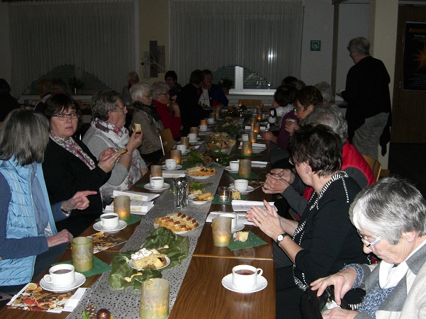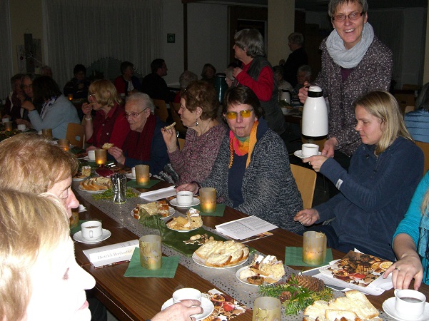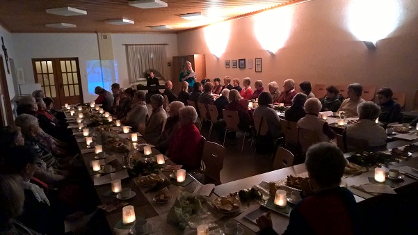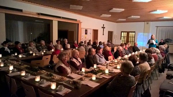 Nach Ende der Roratemesse fand im benachbarten Augustinusheim eine, auch von der kfd gestaltete, besinnliche Adventsfeier statt. Bei leckeren Plätzchen, Kartoffelbrot und Heißgetränken konnte man sich nicht nur in gemütlicher Atmosphäre austauschen, sondern auch adventliche Lieder singen und passenden Texten von Dietrich Bonhoeffer zum Advent lauschen. Diakon Molitor unterstützte die Anwesenden am Klavier musikalisch. Außerdem konnte sich jeder Teilnehmer über ein kleines, thematisch passendes Geschenk in Form eines Teelichthalters freuen, so dass auch alle eine bleibende Erinnerung an diesen Abend mit nach Hause nehmen konnte.