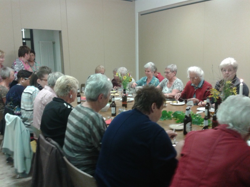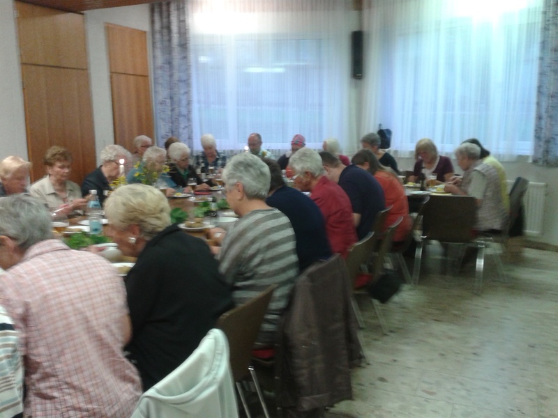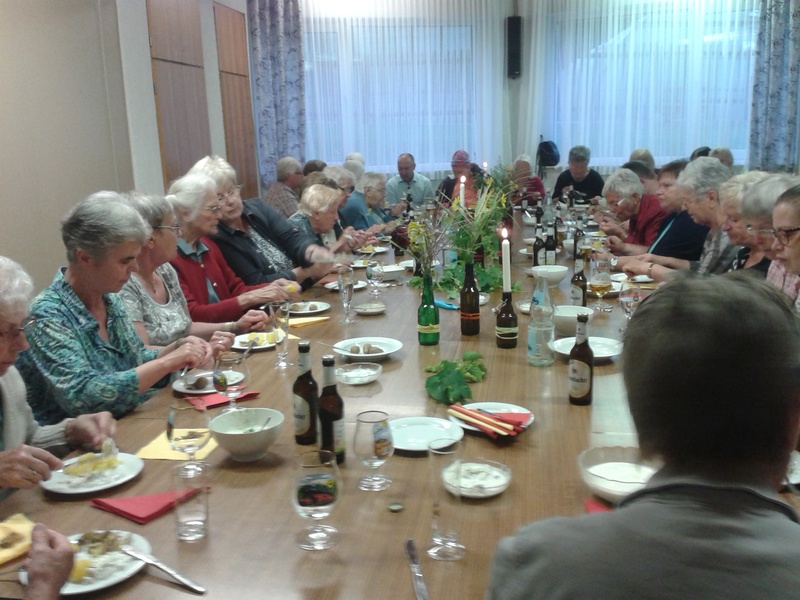 Im Anschluss traf man sich im Gemeindezentrum zum Kartoffelfest. Zu Pellkartoffeln hatten einige Hilchenbacher Frauen Dips zubereitet. So brachte Ursula Wetter einen Heringsdipp mit, Susanne Ferlings sorgte für die Grüne Soße und für die Pilz-Soße, von Monika Kopia war der Kräuterquark und Christine Prior ergänzte die verschiedenen Dips mit einem Tzatziki. So war für jeden Geschmack der entsprechende Dip vorhanden und die rund 40 Frauen und 2 Männer ließen sich dies auch von Herzen schmecken. Das hatte auch zur Folge, dass der kleinere der beiden Gemeinderäume aus allen Nähten platze und die Pellkartoffeln reichlich knapp wurden.