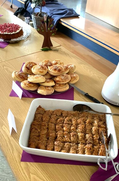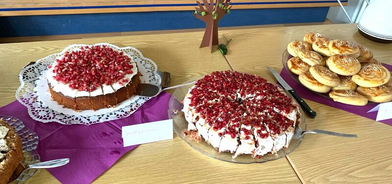Einige Frauen (Christine Prior, Susanne Ferlings, Gabi Langer, Brunhilde Falz und Ingrid Lagemann) hatten verschiedene Kuchen nach Rezepten aus Palästina gebacken, die Dekoration zum WGT-Land und auf den Tischen wurde von Christine Prior und Susanne Ferlings liebevoll vorbereitet und so fand ein rundum gelungener Infonachmittag mit regem Austausch über Palästina statt.