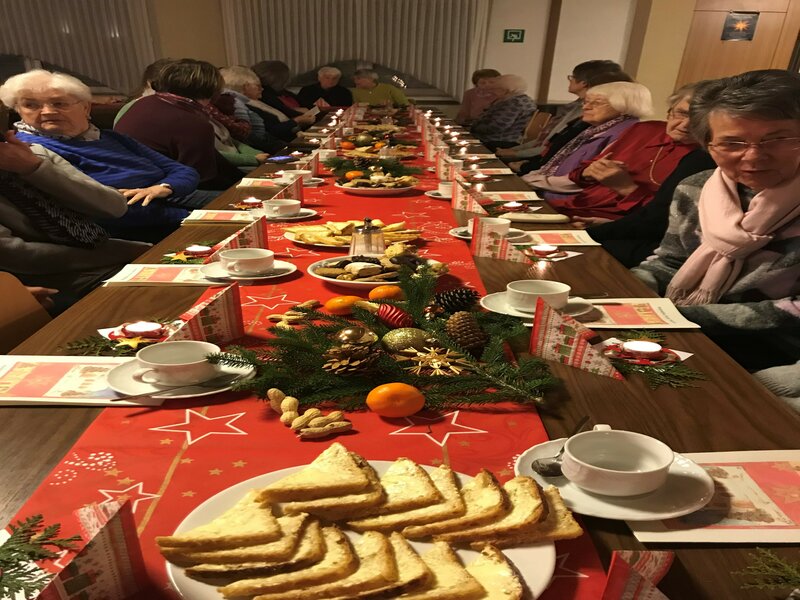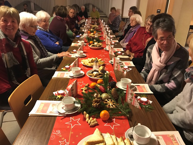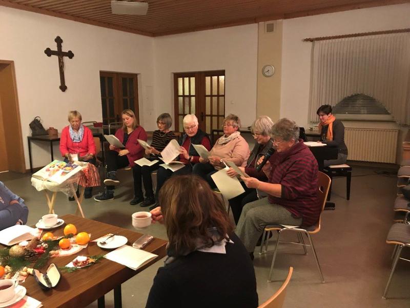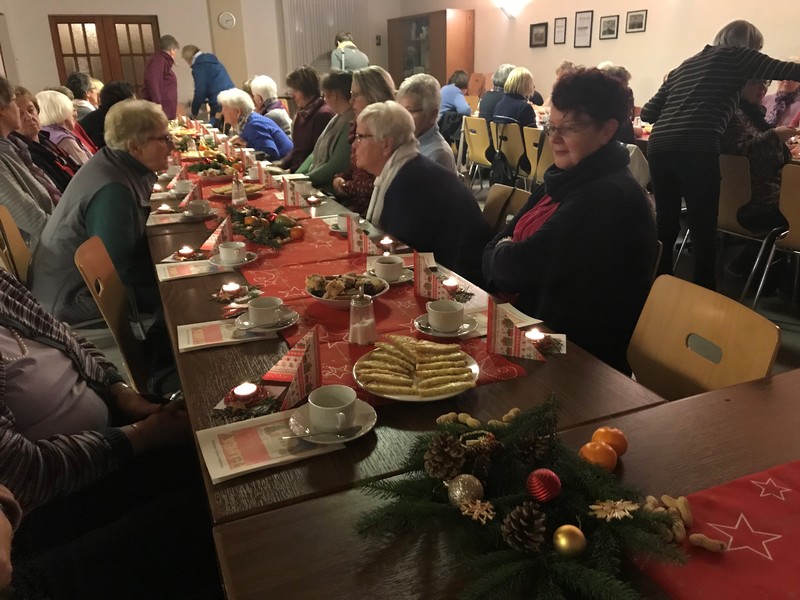 Nach der Rorate fand anschließend im Augustinusheim die Adventfeier statt. Was bedeutet Weihnachten uns heute noch? Sieben Frauen trugen die Argumente und Aussagen vor und zwischendurch sangen die Anwesenden die Strophen des Liedes „Macht hoch die Tür“, wozu Frau Dagmar Leidig am Klavier begleitete. Bei vielen kleinen Lichtern, die als Geschenk für jeden Gast leuchteten und zu Leckereien, wie Gebäck und Glückwein/Punsch und Tee fand ein reger Gesprächsaustausch zwischen den über 50 anwesenden Frauen statt. Zudem fand sich noch Gelegenheit zum Kauf von Adventsbasarartikeln. So endete ein rundum schöner Abend im Advent.