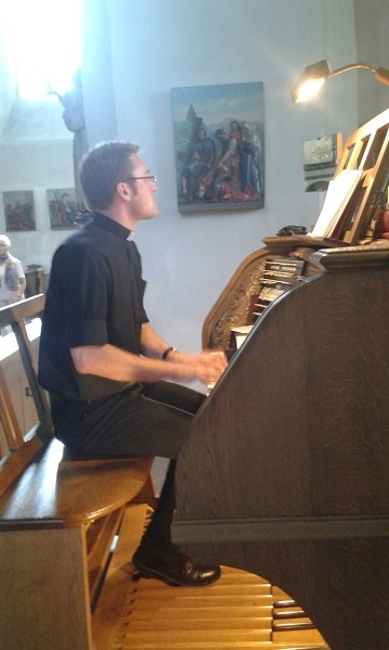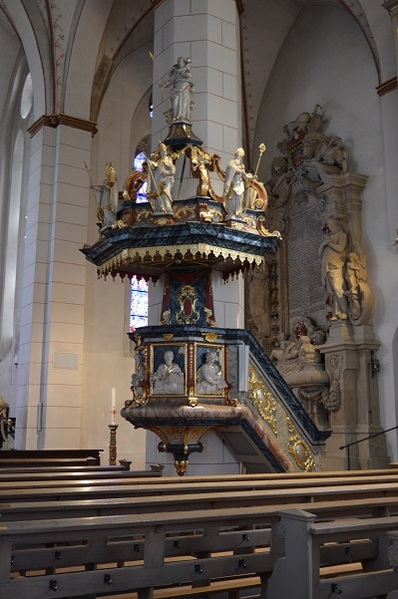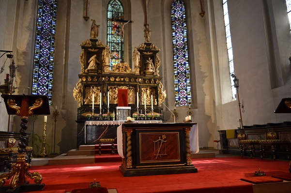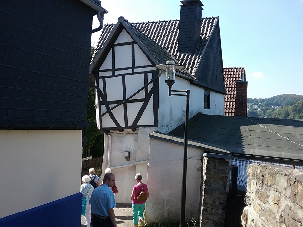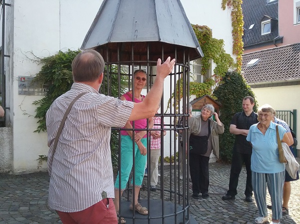 Bei sehr gutem Wetter warteten bereits Stadtführer Josef Hafner und Diakon Dominic Molitor auf die Frauen aus dem Siegerland. Der Stadtführer war schon ein lustiger Mensch, nicht nur das er Christa Menne in einen, für Bösewichte gedachten und aus alter Zeit erhaltenen, drehbaren Käfig sperrte – nein, sondern auch alle die Altstadt hoch und runter führte und dabei eine ganze Menge über Arnsberg erzählte, auch das ein oder andere „Dönekes“. Die letzte Station auf der Stadtführung war die Probsteikirche, wo ein Mitbruder von Diakon Molitor, Diakon Duc Thien Nguyen, auf die reiselustigen Frauen wartete. Diakon Nguyen hatte sich die Zeit genommen und eine Andacht in der Probsteikirche vorbereitet, musikalisch wurde er durch Dominic Molitor an der Orgel unterstützt.