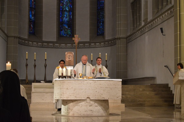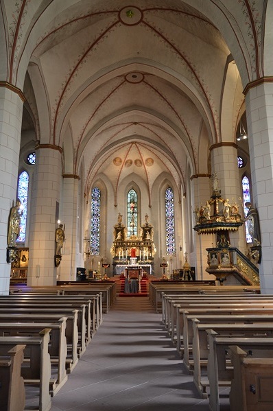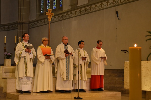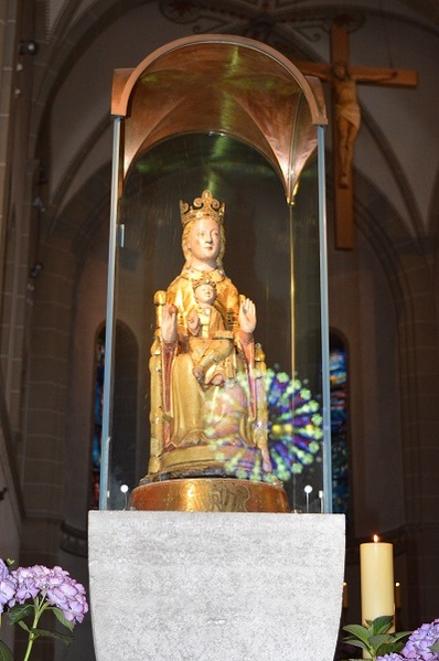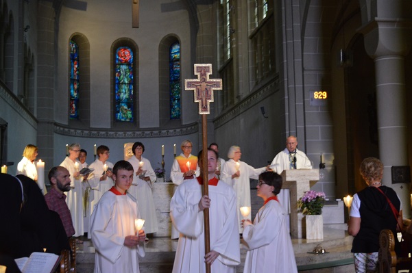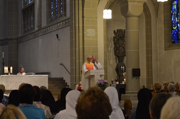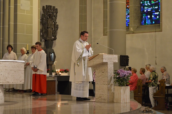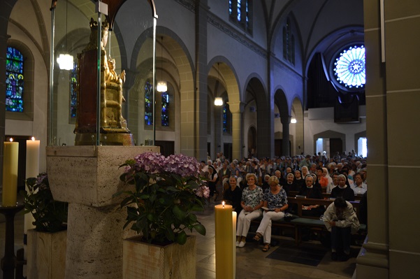 In Werl traf man die beiden Diakone wieder, die auch aktiv am Wallfahrtsgottesdienst in der fast vollständig besetzten Wallfahrtsbasilika teilnahmen. In einer Dialog-Predigt griffen Christa Mertens, Geistliche Begleiterin des Diözesanverbands Paderborn, und Wallfahrtsleiter Pater Ralf Preker die Worte des Evangeliums auf: „Maria bewahrte alles in ihrem Herzen auf und dachte darüber nach." Nach der Lichterprozession durch den Klostergarten und einem Gruppenfoto auf den Treppen vor der Basilika hieß es für alle, "auf nach Hause".